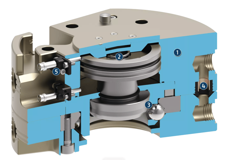 - 2. Piston - Pneumatically driven, ensures locking/unlocking of the system